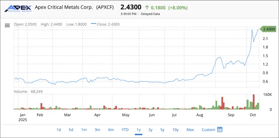At a $130 million market cap, Apex is priced as an early-stage explorer. If its drill program returns meaningful intercepts, the leverage to a re-rating could be significant — consistent with how the market has historically rewarded junior resource discoveries in government-endorsed critical minerals districts.